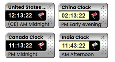 Never go to a website to check what time is it in a different country again. Clocks always visible if needed on your screen. Comes with Flag for each country. 2 Sizes: small and large for available screen space as needed. Show or hide anytime.
