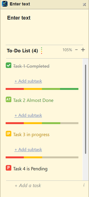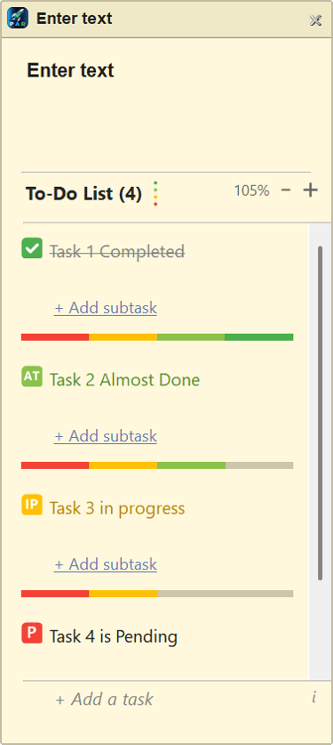 It is like sticky notes for your screen. Notes, to-do lists, allows you to track progress of each task and sub tasks. Set status as Pending, In Progress, Almost Done, & Done. Simple yet effective!