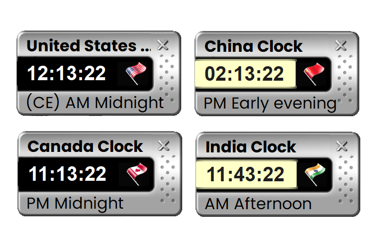 Never waste time to find time in a different country again. Clocks with flags for each country.