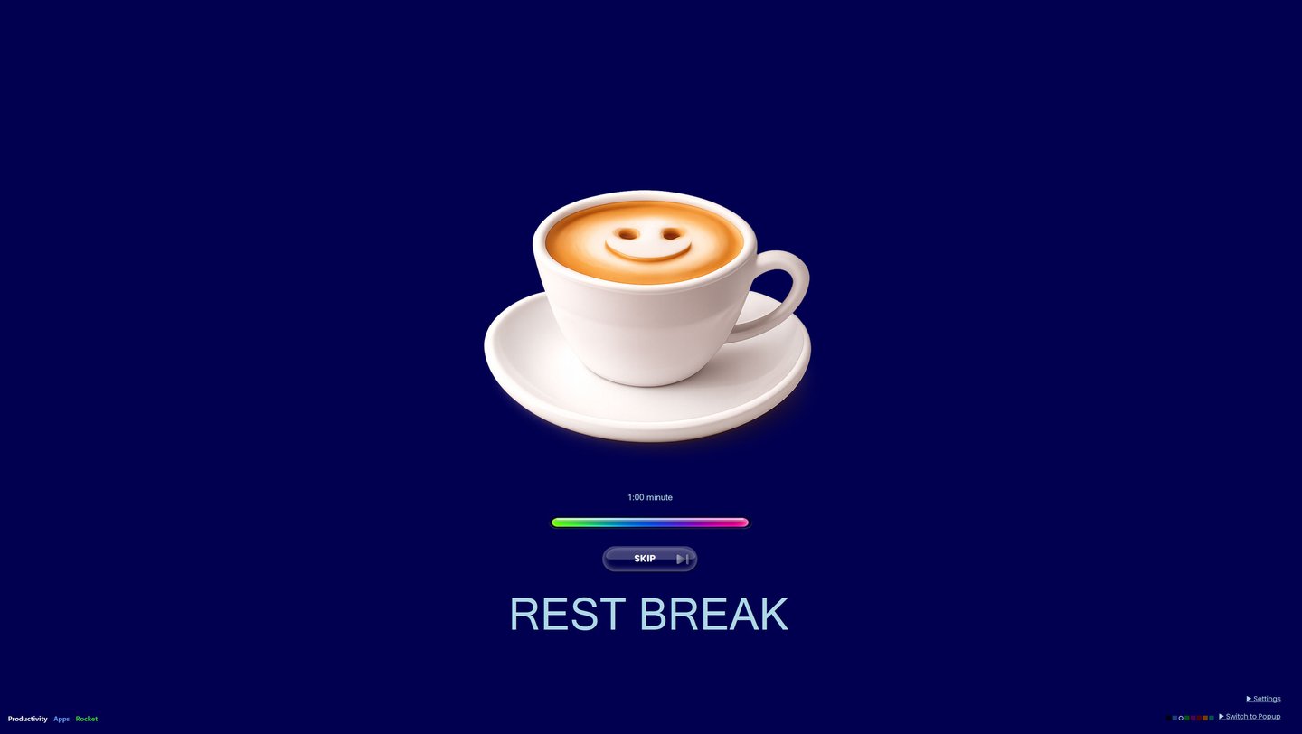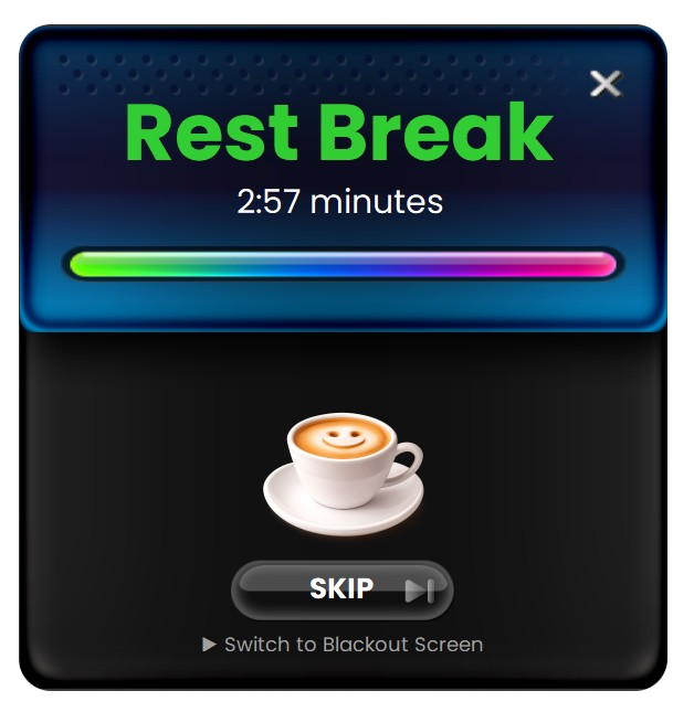 It helps you take pause and break with full screen blackout option with different color schemes.